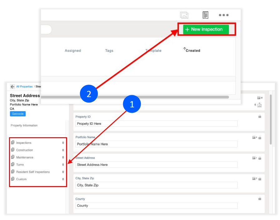 - On the left side, you can add new work that is attached to the container by clicking one of the types of work, like “Inspections” (1). Then, click the +New button on the right to select a template to create a new project attached to the container (2).