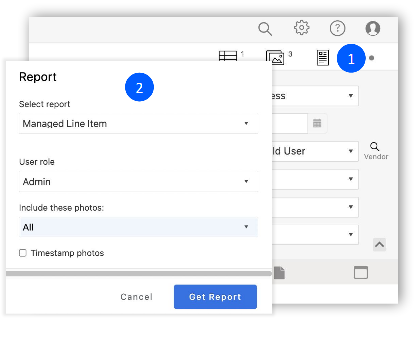 - To generate a report, click into any project and click the PDF report icon in the top right (1).