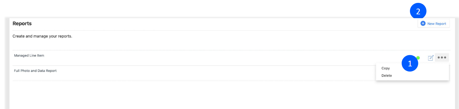 - From here you can click the edit box to the right of any report to make changes or click the three dots to copy or delete a report (1).