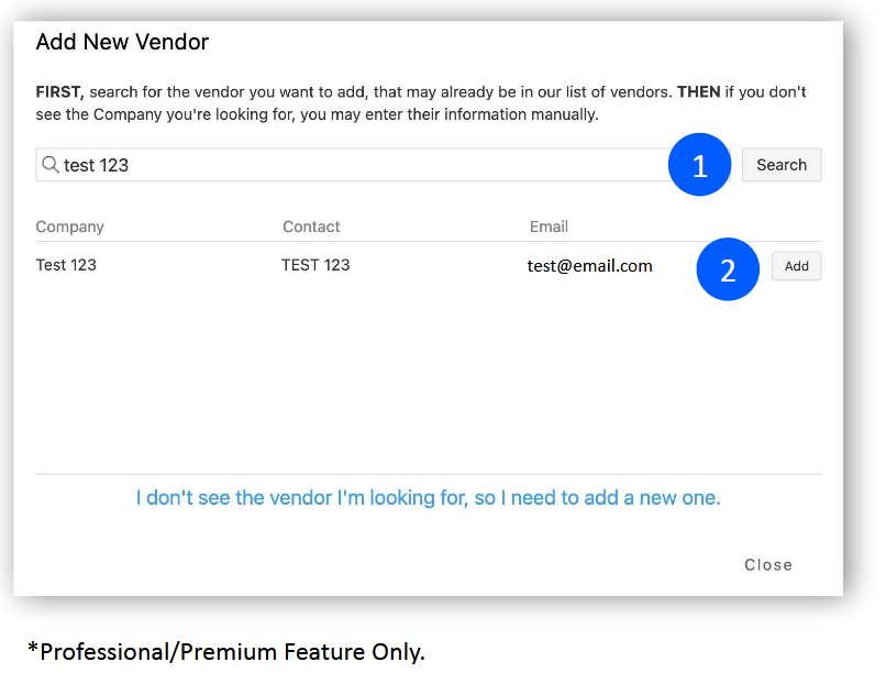 - If you tried to find the vendor in the Find and Add Vendor but they were not in the list, you can add a new vendor by clicking the Add New Vendor button at the bottom (1).
