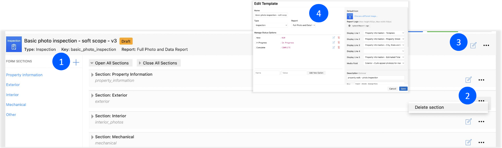 - On the left, you’ll see a list of the sections in your template. To add a new section, click the + sign at the top (1). To delete a section, click the three dots to the right of the section and click Delete section (2).