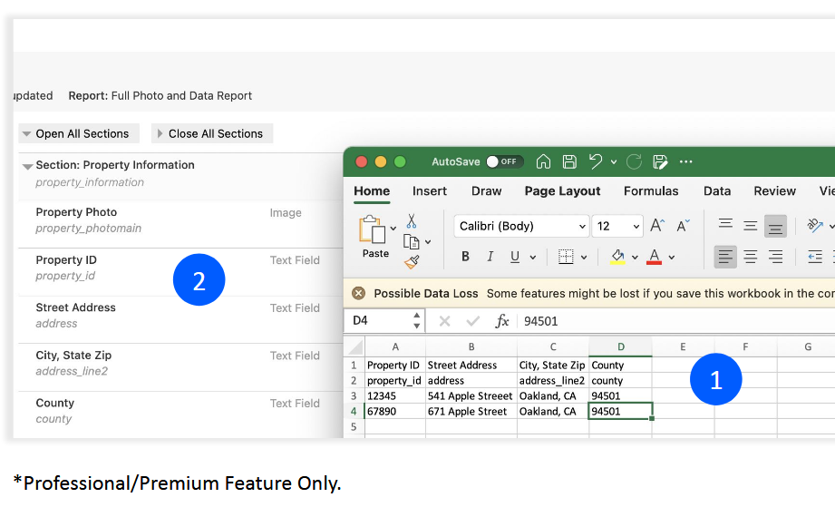 - In your .csv file, create two rows. The first row is the field name (from your container template) and the second is the field key (from your property template) (1). The field keys must match exactly what is in your container template (2).