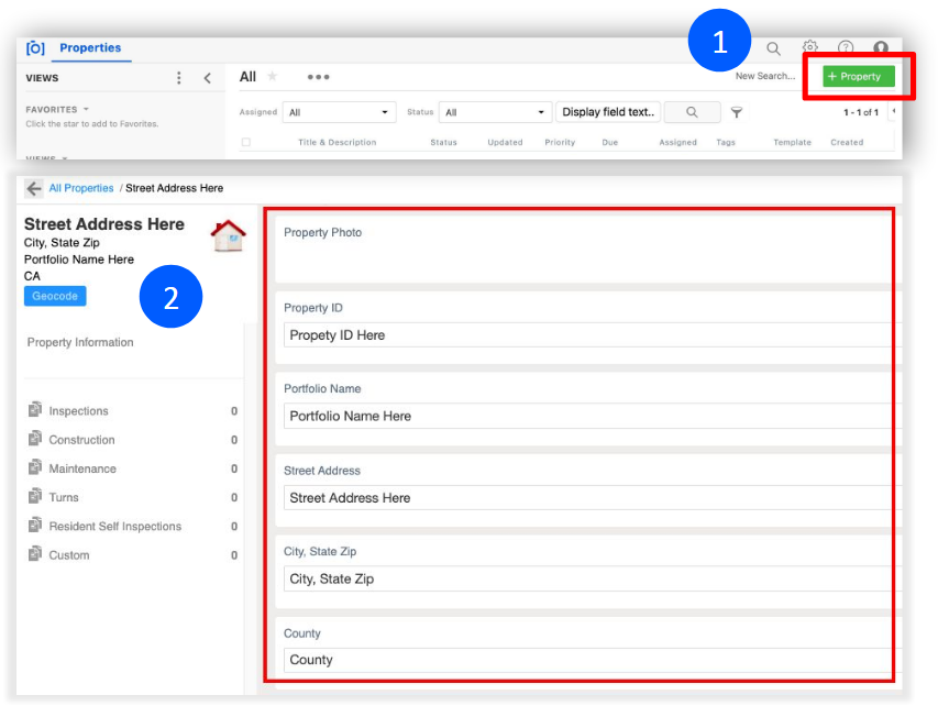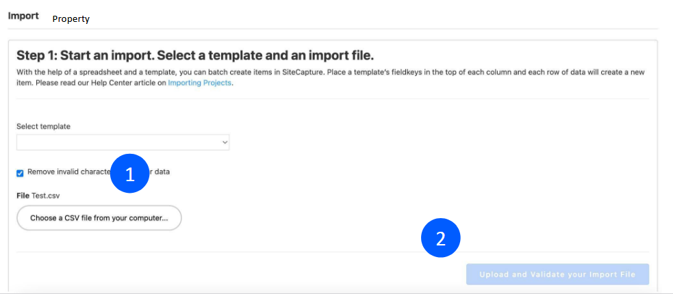 - On the import page, select the container name type (for example, Properties) in “What would you like to import?”. In the template dropdown, select your container template. If you would like to automatically remove invalid characters from your spreadsheet so the import works, check the box next to that option (1). Click the Choose a CSV file from your computer… button and select your file. Click Upload and Validate your import file (2).