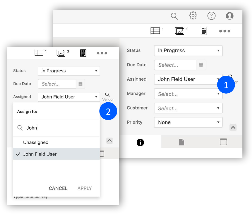 - To assign a field user or vendor, click the Assigned dropdown, type the field user or vendor’s name, select them in the dropdown, and click apply (2).