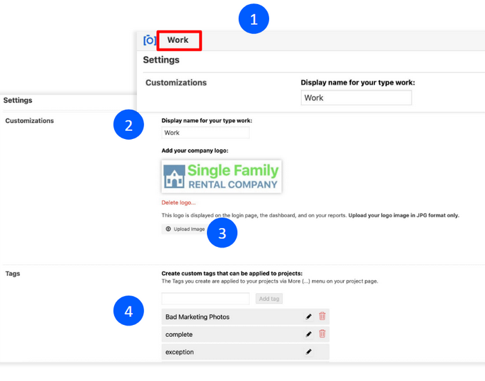 Portal Admins can manage the name for the work link displayed in the top toolbar (1) and add a company logo.