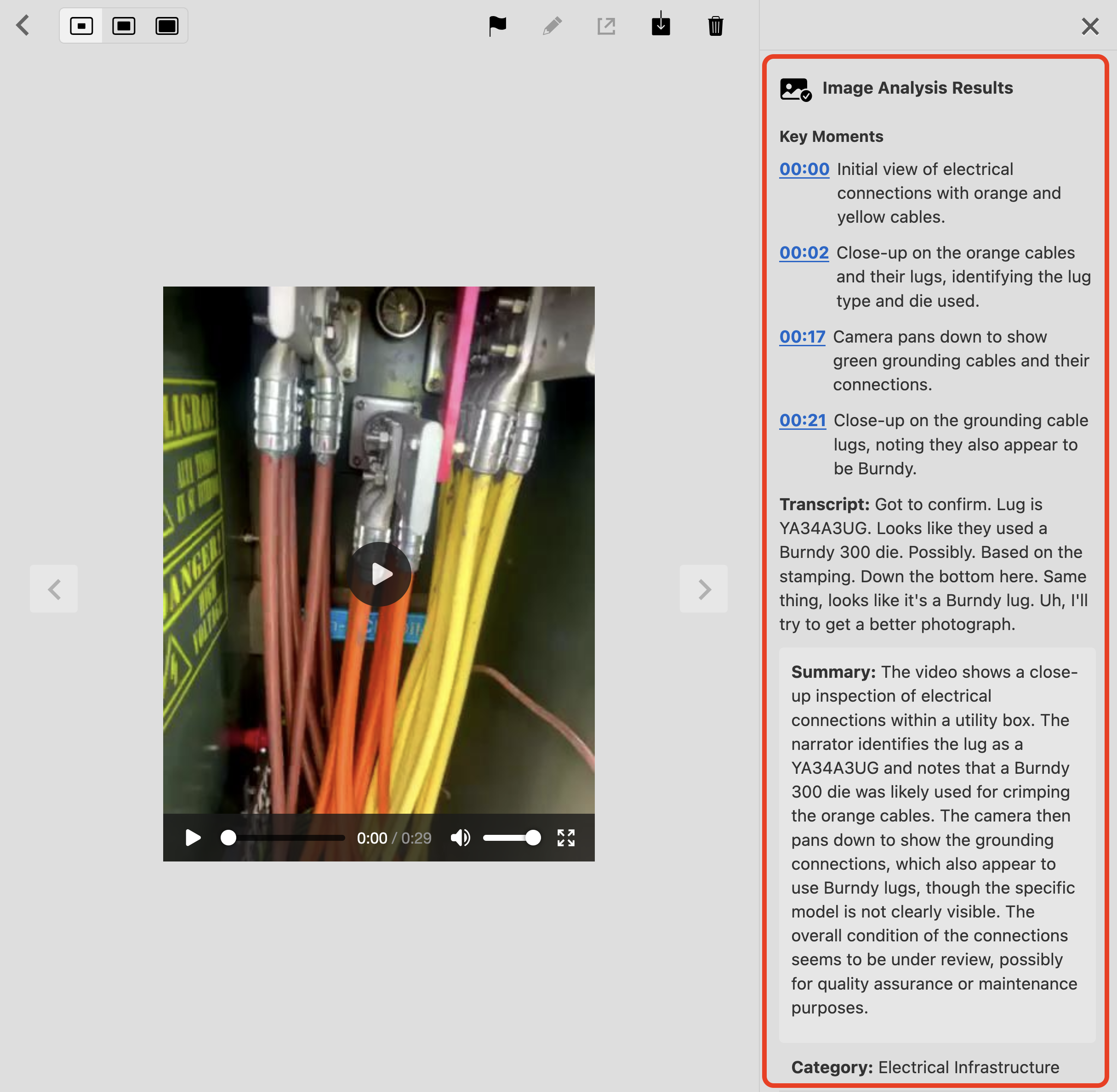 - Video Analysis may include tags, category, duration, key moments, transcript, and summary.