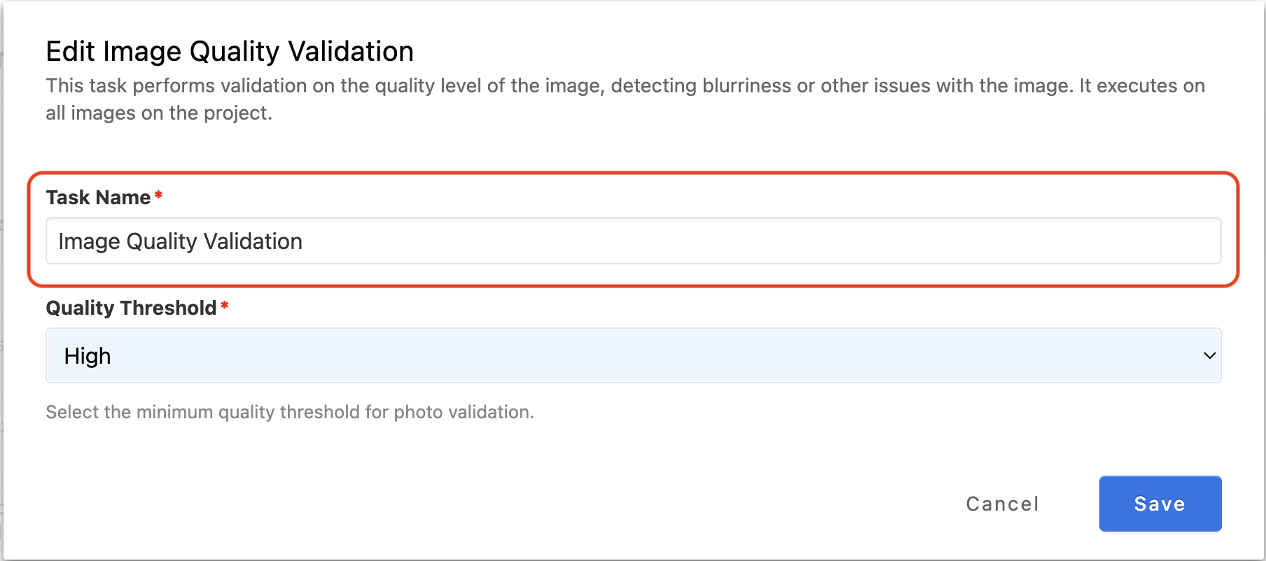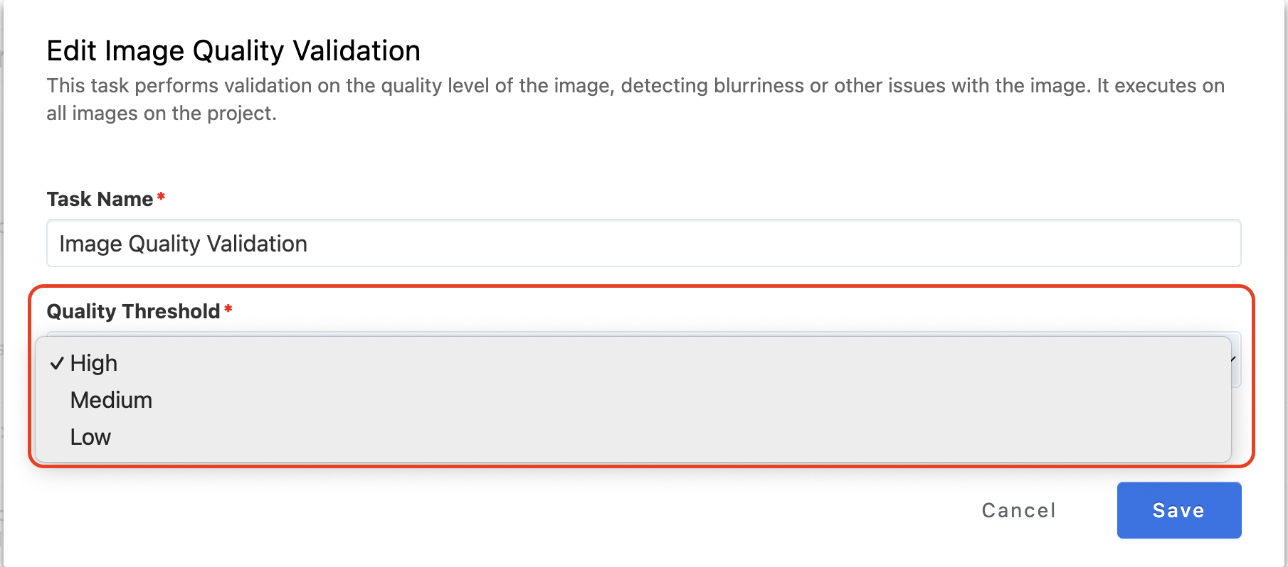 The Image Quality Validation task provides a simple, clear workflow for ensuring that all images meet your project's quality standards. Configuring the task involves selecting a threshold level and saving your changes through an intuitive modal interface.