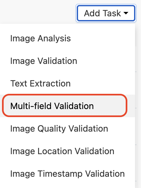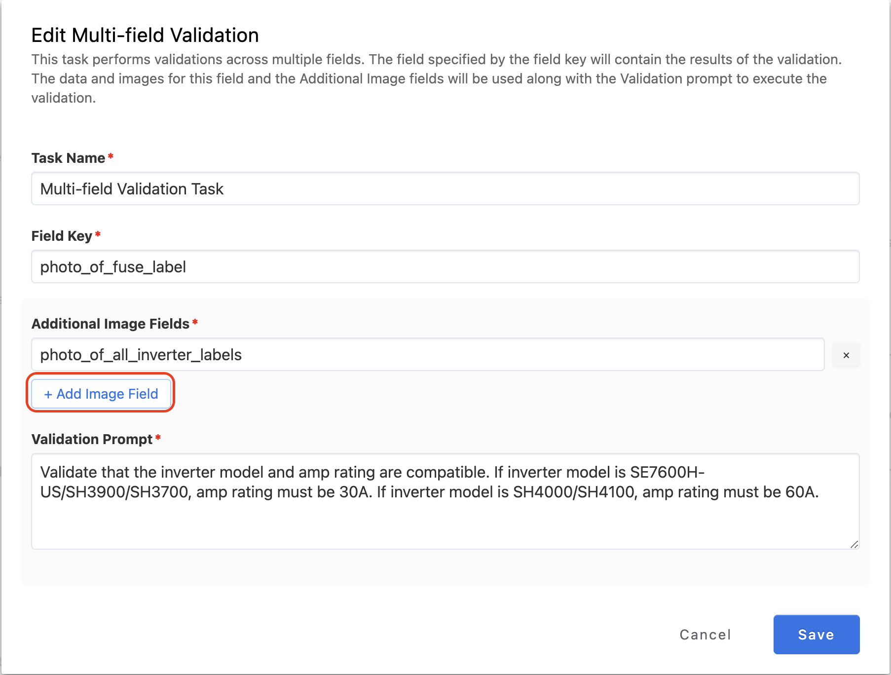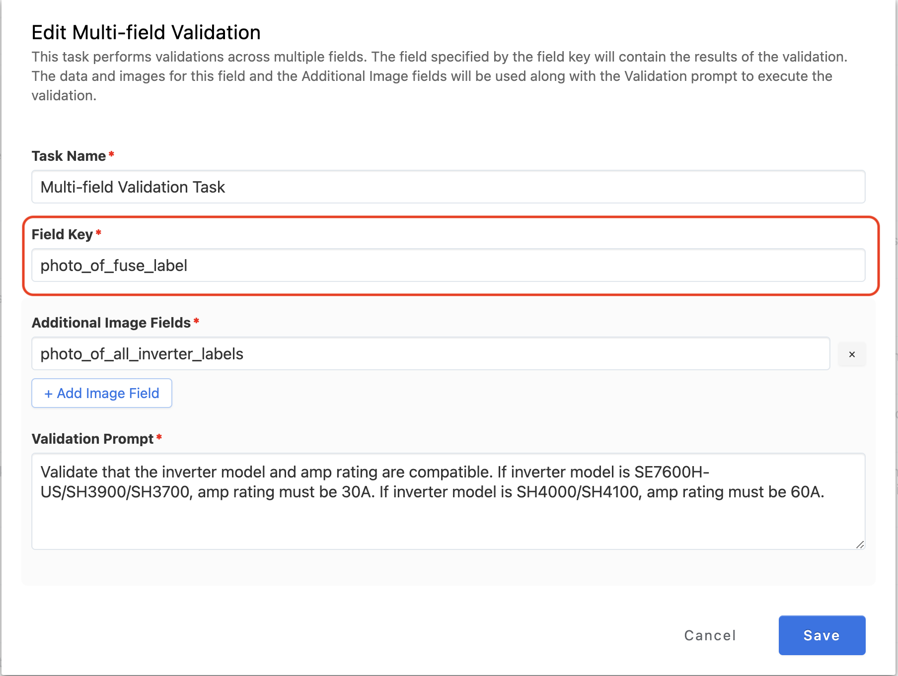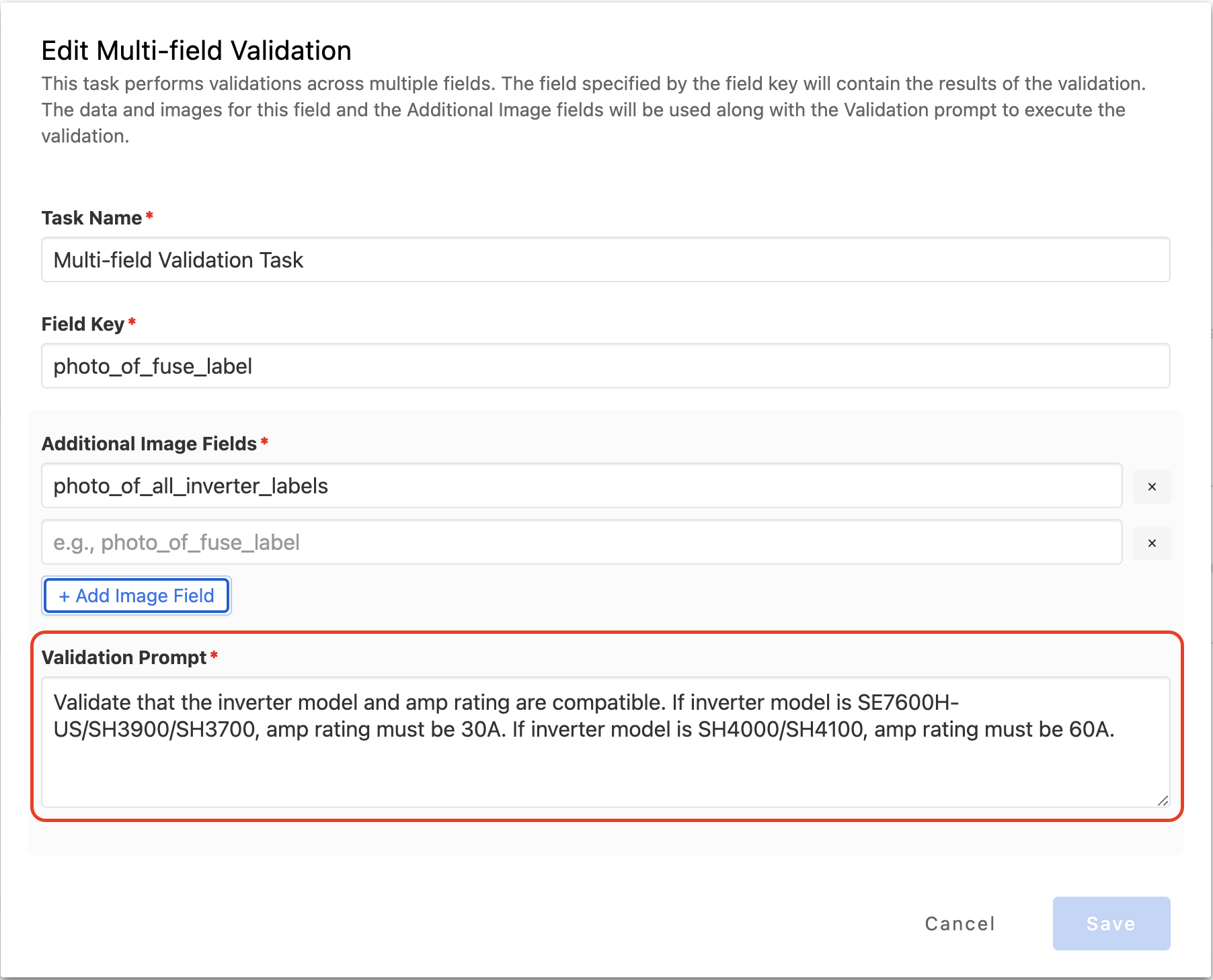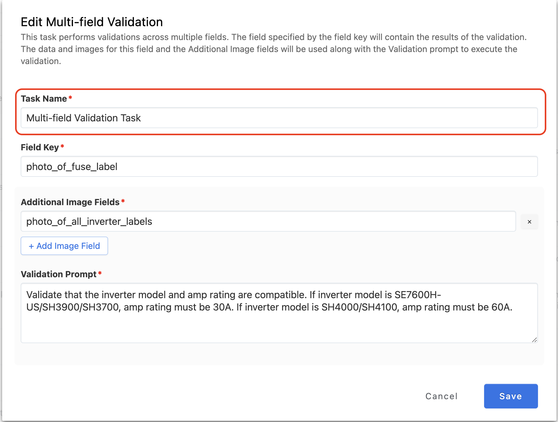 The Multi-field Validation task allows users to configure and run validations across multiple fields. This includes evaluating both data and images from selected fields using a custom validation prompt. All results are saved into the primary field specified by the user.