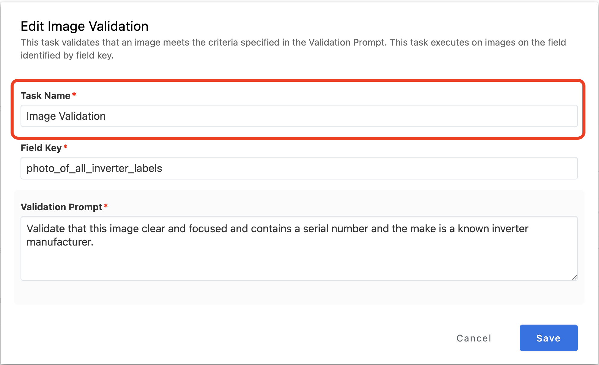 The Image Validation task is designed to validate whether an image meets the criteria defined in a custom Validation Prompt. The validation applies to images contained in the field identified by the field key.