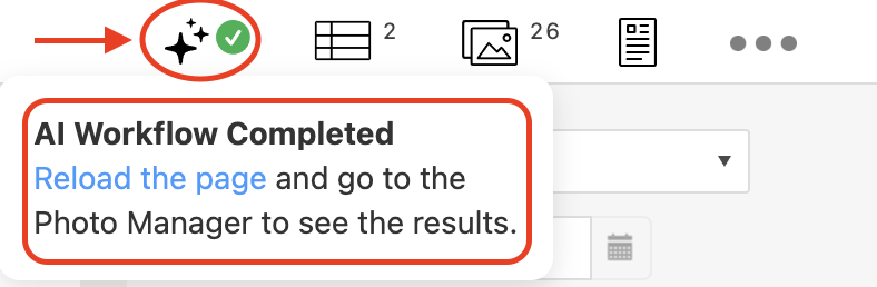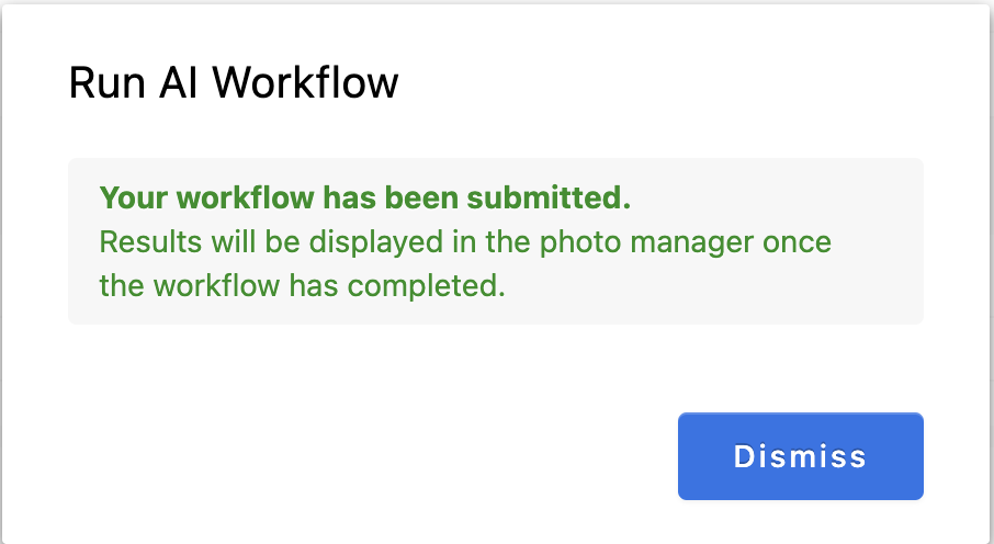 - After clicking on Run AI Workflow admins will see a confirmation that the workflow has been submitted. Results will be displayed in the photo manager once the workflow has completed.