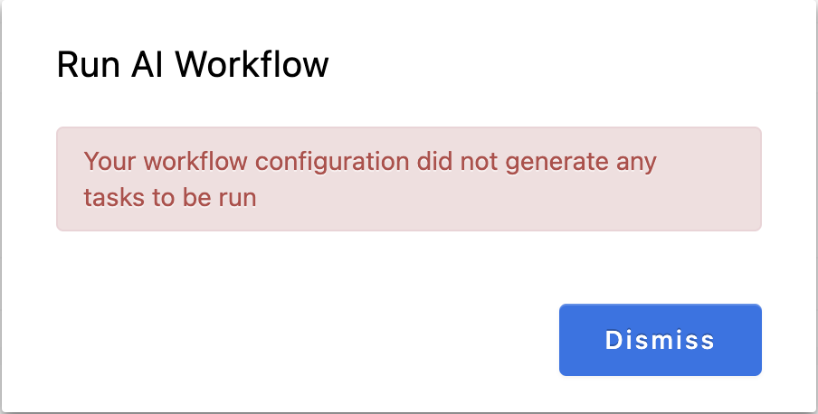 Error Messaging: If the workflow configuration selected did not generate any tasks to be run, admins will see an error message. Click on Dismiss to close the modal.