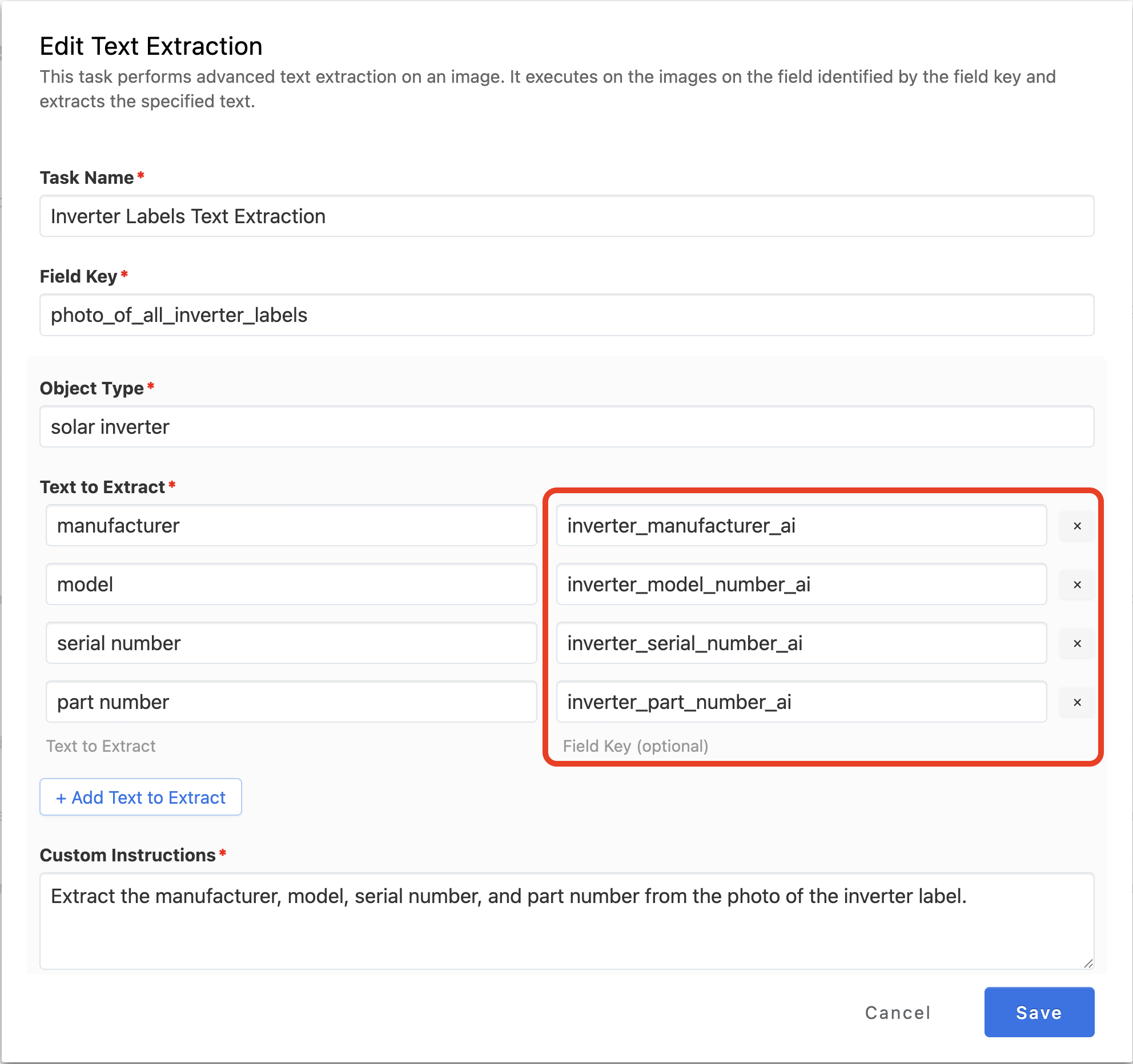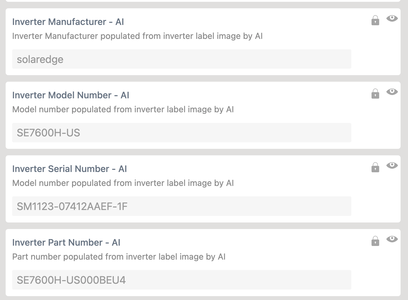 - Use consistent and accurate field keys (For example: inverter_model_number_ai)