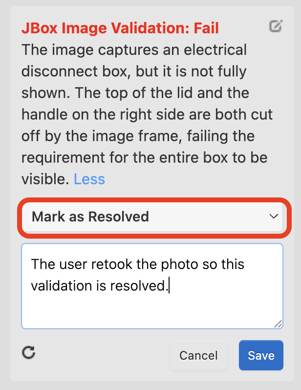 This feature is only available to Portal Admins and Managers. If a field user resolved the issue that caused a validation to fail, admins can now manually resolve it so it no longer appears as Failed. Follow the steps below to update the validation status.